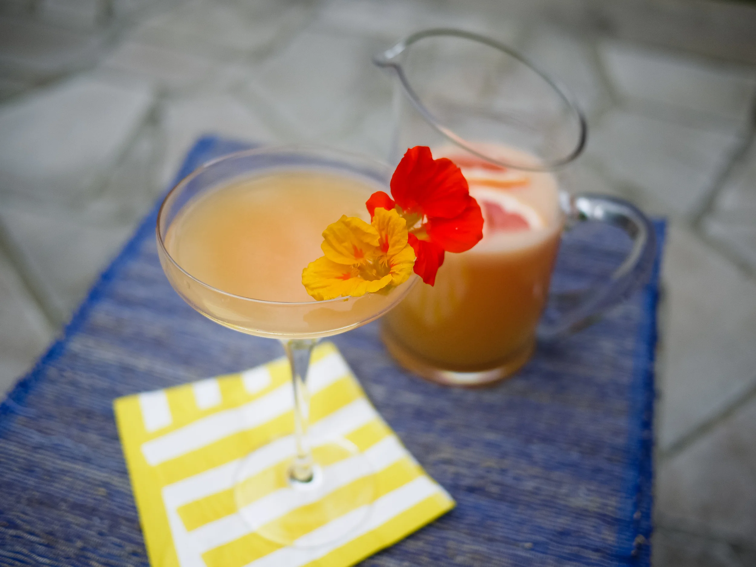 Andrew's punch combines Flora with fresh citrus juices and a little fizz for the perfect daytime drink. We'll timestamp this one at about 1:15pm Saturday. And, can we talk about how pretty it is? A beautiful blush hue, dressed up with some nasturtiums from the garden.